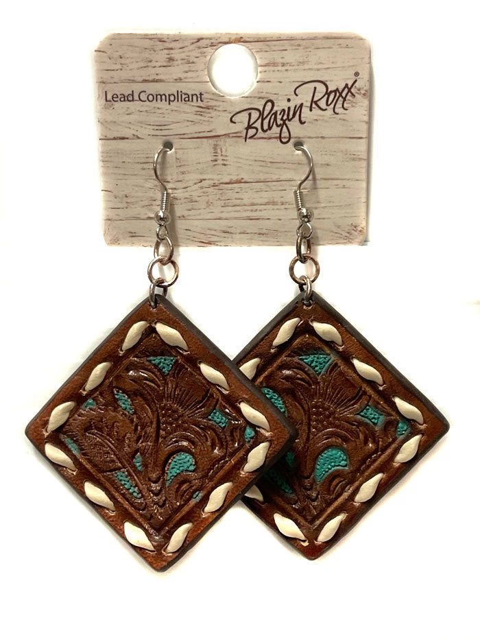 Blazin Roxx 30969 Womens Laced Edge Leather Earrings Brown – When a simple look needs a bit of glam reach for these Blazin Roxx earrings by M&F Western Products. Genuine embossed leather earrings that are pierced with turquoise underlay and ivory buck laced edges. Pair with a simple shirt and jeans or compliment your little black dress for a special occasion.