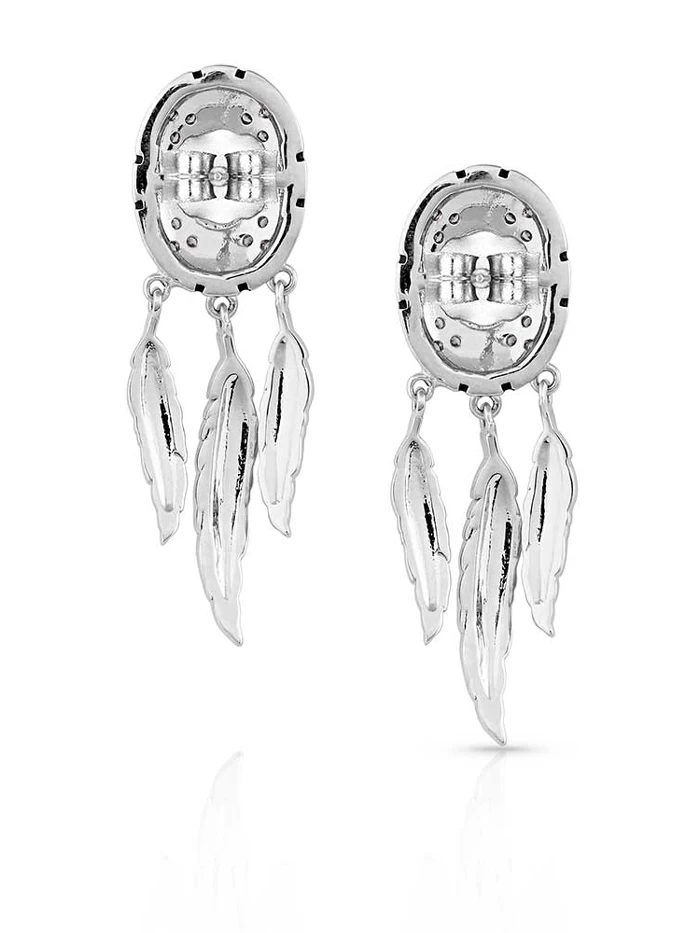 Montana Silversmith ER5305 Womens Divine Touch Opal Earrings Silver – The enchanting white opal and sparkle of the Divine Touch Opal Earrings are awe-inspiring. The center white opal stone is the centerpiece of the earrings, surrounded by small clear cubic zirconia stones, and a southwest design on all four sides adds to the allure of the design. Falling below are three stunning silver-tone feathers to create movement in the earrings. A hypoallergenic post-back wire completes the piece.