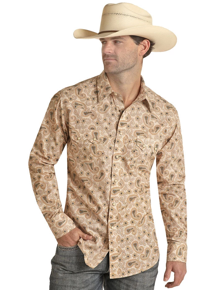 Rock & Roll Denim RRMSOSR0QA Mens Long Sleeve Paisley Vintage Snap Shirt Brown