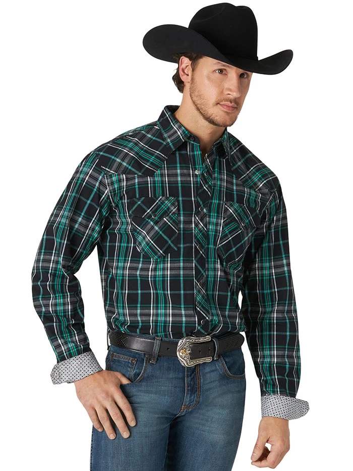 Wrangler MJC302G Men’s 20X® Competition Advanced Comfort Shirt Black Green features contrast stitching, this 20X Competition Advanced Comfort woven shirt will be your new favorite. Western yokes, two snap cuffs, Moves With You and contrast trim round out this great button down.